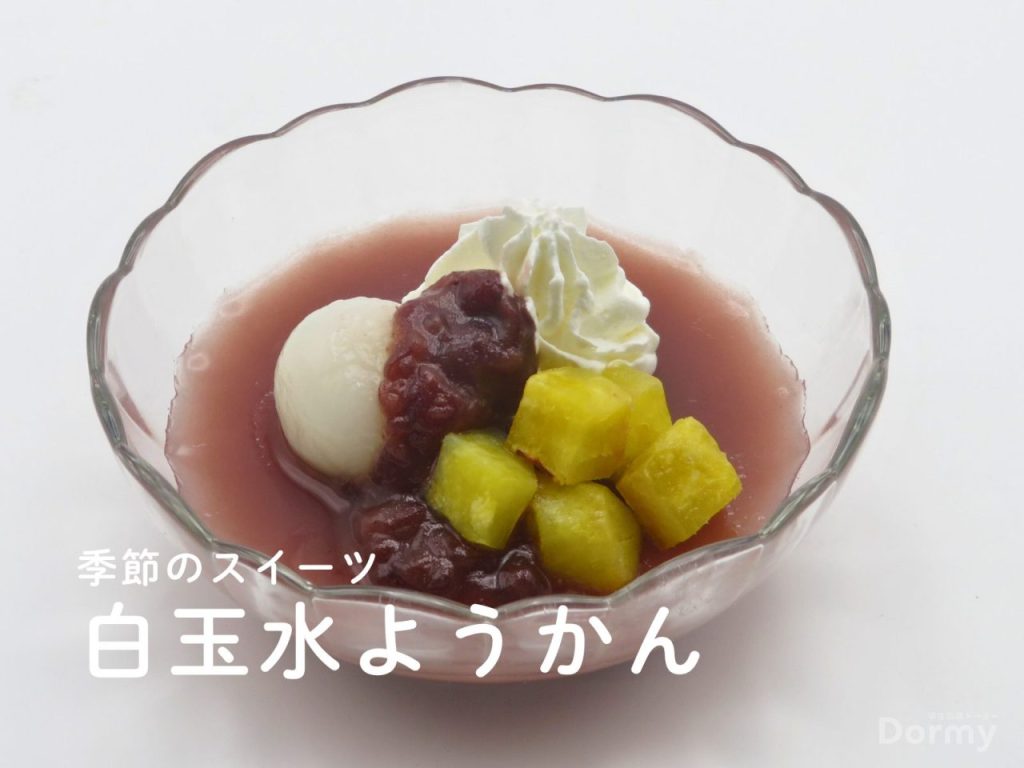 つるんとなめらかな水ようかんに、もちもちの白玉団子と秋の味覚・さつま芋を添えました。見た目にも美しく、季節感を楽しめる一品です。食後のデザートとして大好評でした!