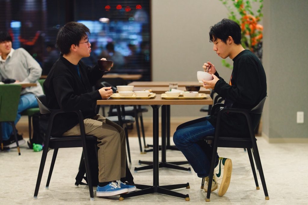 小田: 僕は朝は8時頃、夜は20時過ぎに食べに行くことが多いですね。あと「寮の食堂」というと「みんなでワイワイ食べなきゃいけない」みたいなイメージがあるかもしれませんが、ここは全然そんなことなくて。グループで食べている人もいれば、僕みたいに一人でスマホを見ながら食べている人もいる。