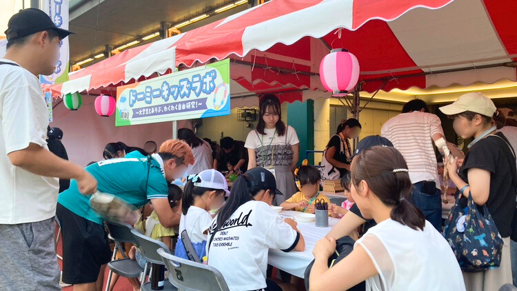 2日間合わせて約240名の子どもたちがドーミーキッズラボに参加してくれました。工作体験は、牛乳パックで作るカメラ、UVビーズのブレスレット、うちわのデコレーションの3つ。RA(レジデント・アシスタント)が作り方を教えて、子供たちは真剣に取り組んでいました。親御さんたちが温かく見守る中、完成した作品を嬉しそうに見せ合っている子どもたちと、それをサポートしたRAたちの笑顔にほっこりしちゃいます。